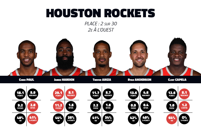 Du côté des joueurs qui rempilent, Ryan Anderson et Eric Gordon vont encore faire un malheur, tandis que Trevor Ariza, sous-estimé, est l’ailier idéal pour faire le liant. Sous les panneaux, Clint Capela aura encore Nene Hilario pour l’épauler, et on a bien vu, en playoffs, combien l’absence du Brésilien pouvait être préjudiciable. Tarik Black, qui connaît la maison, peut aussi faire du bien sur de courtes séquences.