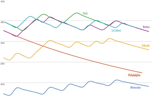 En regardant l'évolution du pourcentage de victoire des Bucks, des Sixers, du Magic, des Celtics, des Lakers et d'Utah (ces trois dernières se mêlant ces derniers jours), on se rend ainsi compte qu'elles plongent à vitesse grand V. Et c'est logique puisque toutes ces équipes accumulent les défaites.