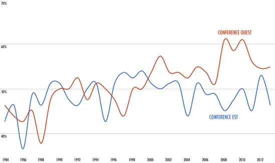 Difficile donc de dégager des causes claires au fossé qui s'est creusé entre les deux conférences mais ce qui est sûr, c'est que la barre pour atteindre les playoffs à l'Est est finalement assez stable depuis 1984 puisqu'elle oscille autour des 50%. À l'Ouest, c'est beaucoup plus dur depuis le lockout de 1999.
