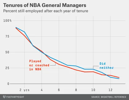 Or la proportion de dirigeants toujours en place au fil des années à la tête de leur équipe est similaire qu'un GM soit un ancien joueur/entraîneur ou qu'il n'ait jamais eu ce type d'expérience en NBA.