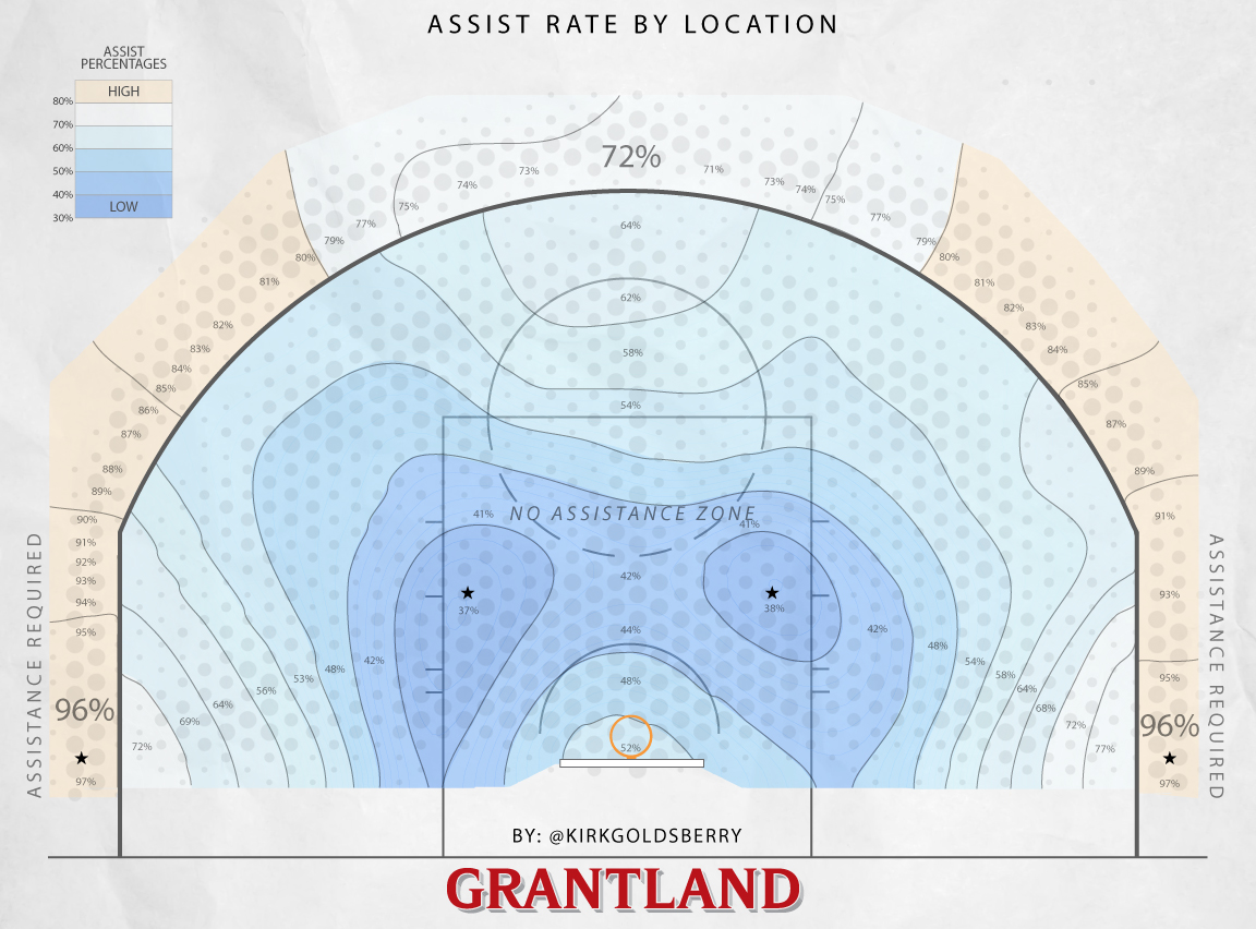 Kirk Goldsberry a d’ailleurs créé une intéressante carte générale des zones où les tirs sont “assistés”.