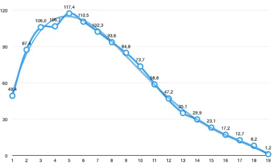 C'est pour ça que j'ai décidé de collecter tous les WS, année par année, de chaque joueur de chaque Draft depuis 1995. Un travail pénible et fastidieux qui m'a permis de tracer une courbe d'efficacité moyenne.