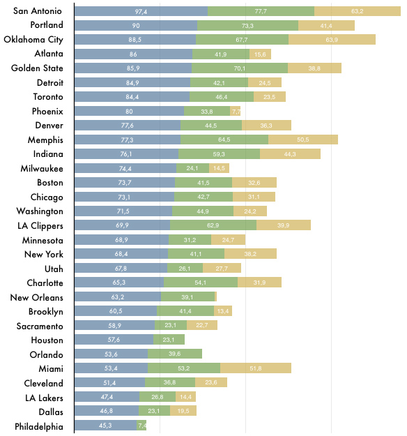 San Antonio est en tête puisque les Spurs ont conservé l’effectif qui a terminé la saison, en rajoutant simplement le rookie Kyle Anderson. La franchise texane mise sur une grande continuité, avec des joueurs représentant 97% des minutes l’an dernier de retour dans l’effectif.