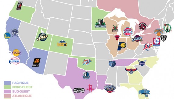 La conférence Ouest serait formée par les divisions Pacifique et Centrale tandis que la Conférence Est serait elle composée des divisions Sud-Est et Nord-Est. Les noms peuvent évidemment varier mais le découpage géographique serait en tout cas celui-ci.