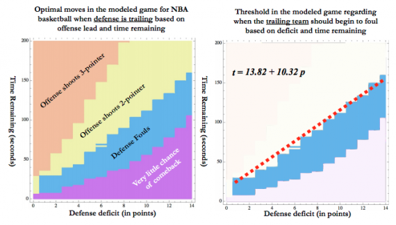 Une autre étude passionnante s’est penchée sur les fautes en fin de match, utilisées par les équipes pour arrêter les possessions adverses et tenter de revenir au score. Franklin Kenter a ainsi modélisé un match de basket en termes de choix simples : shooter à deux points, shooter à trois points, faire faute… Le but était d’évaluer quelle était la meilleure décision (du point de vue statistique) dans chaque cas de figure et les résultats sont très intéressants.