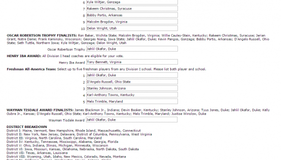 La Midnight Madness, coup d’envoi de la saison universitaire, me semble avoir eu lieu hier et pourtant, nous voici déjà aux portes de la Champ Week et de la March Madness, la compétition la plus excitante du calendrier sportif américain. Comme chaque année, le début du mois de mars indique la fin de la saison régulière et il est tant de se pencher sur les “Awards” de fin de saison. En qualité de membre de l’United States Basketball Writers Association (USBWA), je dispose d’un droit de vote pour décerner quelques uns de ces prestigieux trophées : l’Oscar Robertson Trophy du meilleur joueur, le Wayman Tisdale Trophy du meilleur freshman, le Henry Iba Trophy du meilleur joueur, et bien évidemment les All-American Teams. La cérémonie de remise des prix n’aura lieu que le 14 avril prochain à Oklahoma City mais les votes doivent être enregistrés dès cette semaine. Je vous livre mes choix pour cette saison 2014-2015 (mes votes pour 2013-2014).