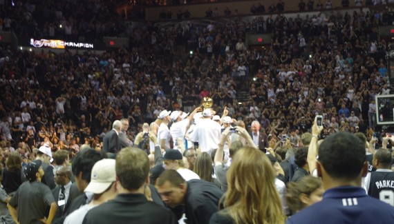 Lors des dernières Finals, San Antonio s’impose à la maison pour le match 5. L’émotion est à son comble pour la troupe de Popovich, Duncan, Parker et Ginobili. Le trophée arrive lentement mais sûrement sur le podium monté à la va-vite sur le parquet de l’AT&T Center. Je débarque alors de ces affreux monte-charges qui nous servent d’ascenseurs et me précipite vers le parquet. Je vois une foule immense autour des nouveaux champions, déjà en scène. Ça bouge dans tous les sens, les spectateurs des premiers rangs ont déjà (de joie) envahi les planches.