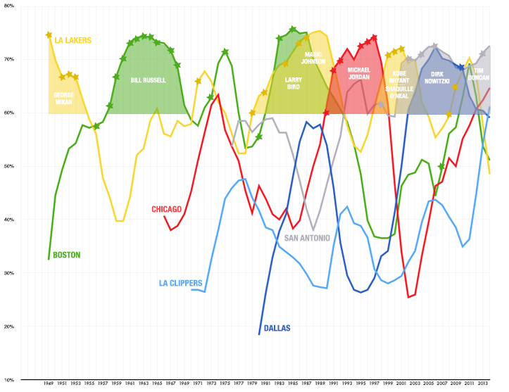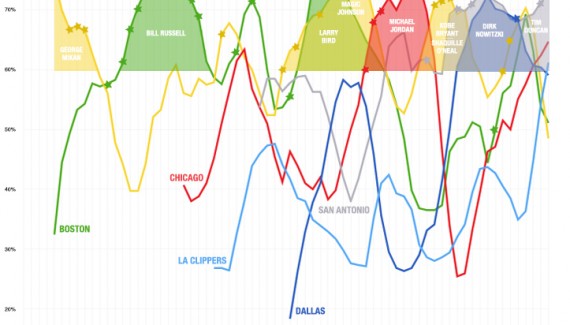 Les courbes de Dallas et des LA Clippers se croisent d’ailleurs en fin de saison dernière, symbole de la montée en puissance du groupe mené par Chris Paul et Blake Griffin et du déclin de celui de Dirk Nowitzki. À côté, j’ai aussi représenté les grandes dynasties de NBA (Boston, LA Lakers, Chicago, San Antonio) et on voit bien que toutes les grandes équipes ont connu des cycles, alternant succès (les titres étant symbolisés par une étoile) et mauvaises saisons.