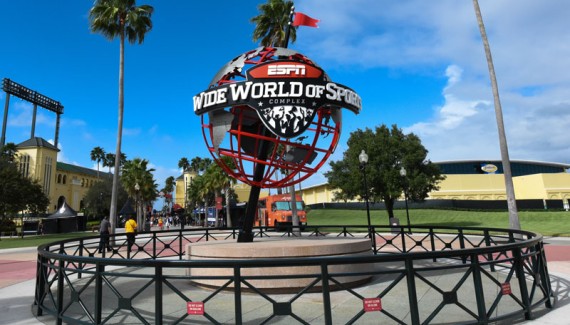 Je prends donc la direction du sud vers le parc d’attraction de Walt Disney World. Passé sous l’arche qui matérialise mon arrivée dans le monde merveilleux de Mickey Mouse, je guette avec précaution les flèches indiquant l’« ESPN Wide World of Sport ». En effet le groupe ESPN, filiale de Disney a développé à deux pas d’ici un complexe sportif hors norme qui propose aux athlètes de tout âge et de tout niveau des conditions de jeu idéales dans une multitude de disciplines. Le complexe s’étend sur 200 hectares dans un environnement arboré et luxuriant. On peut y pratiquer près de 60 sports. C’est ici par exemple que les Braves d’Atlanta en Major League Baseball organisent chaque année leur Spring Training. Il y a donc un stade de Baseball, une quinzaine de terrains de Soccer dotés de pelouses naturelles impeccables ainsi que plusieurs salles polyvalentes dont le HP Field House où se déroulera aujourd’hui l’Advocare Invitational qui fait partie des tournois NCAA les plus huppés de la période de Thanksgiving.