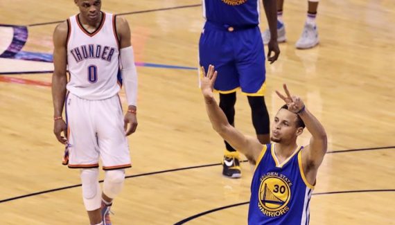 Est-ce quand Russell Westbrook a rigolé à l’évocation de la défense suspecte de Stephen Curry ? Est-ce quand Draymond Green a réchappé de justesse au glaive de la justice NBA ? Est-ce quand Klay Thompson a littéralement pris feu au match 6 ? Est-ce quand Kevin Durant et Russell Westbrook ont sabordé le jeu collectif du Thunder pour jouer les héros solitaires ? Est-ce quand Andrew Bogut est sorti de sa léthargie ? Il y en aurait des lignes entières…