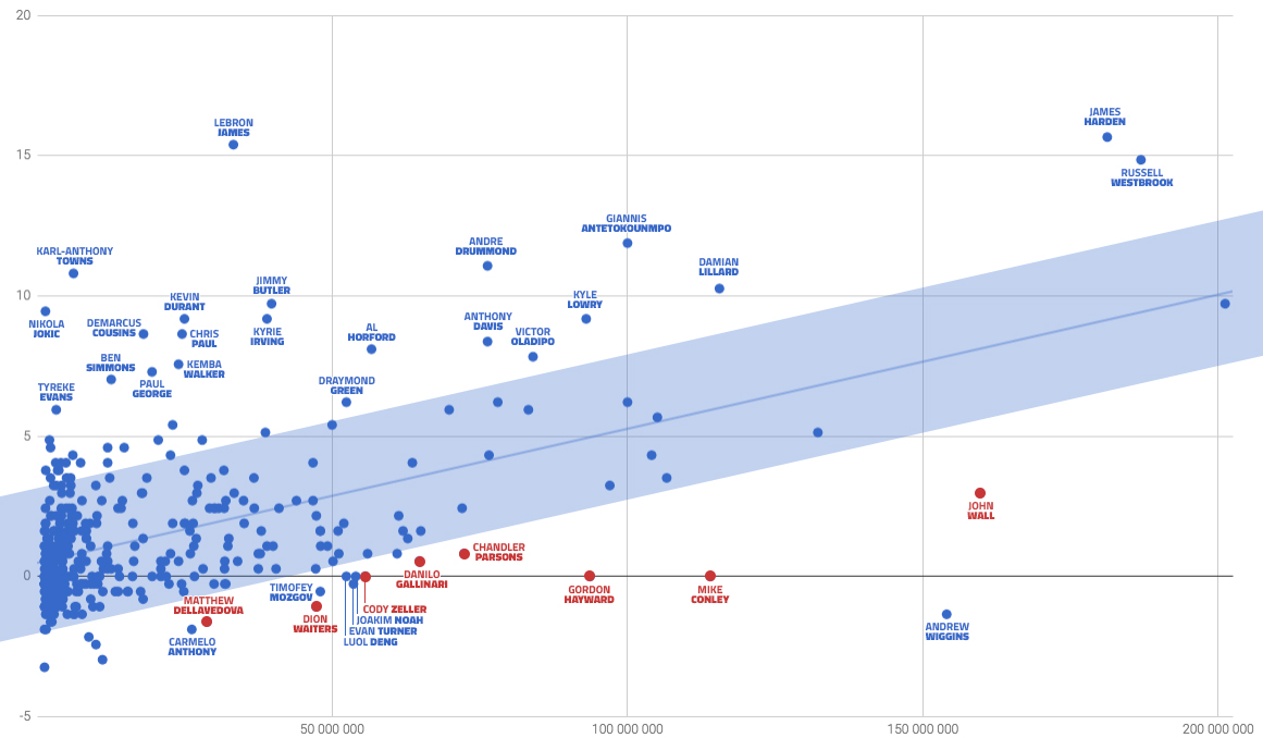 Au centre du graphique, on retrouve la grande majorité des contrats, meilleurs ou moins bons que la moyenne. Largement au-dessus, on voit ce qu’on peut appeler les “très bons contrats”, soit parce que les joueurs sont encore payés comme des rookies tout en apportant déjà beaucoup (Nikola Jokic, Ben Simmons, Karl-Anthony Towns), soit parce qu’ils sont productifs avec peu d’années encore garanties (Jimmy Butler, Kyrie Irving, Kevin Durant…) soit parce qu’ils sont juste extrêmement productifs (LeBron James, Russell Westbrook, James Harden…).