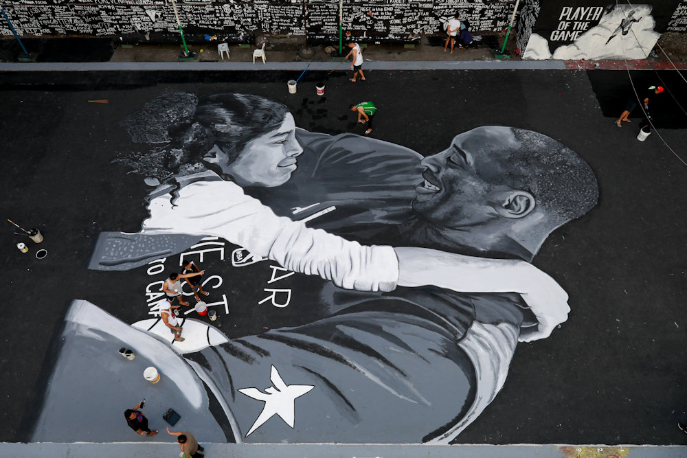 Ailleurs, dans le monde, l’émotion est aussi grande et elle se matérialise. En Asie, où il se rendait quasiment chaque année, Kobe Bryant était un demi-Dieu. Mais l’émotion et le recueillement sont partout, et quelques heures après sa mort, des veillées s’organisent, des fresques apparaissent, des villes et des salles prennent les couleurs des Lakers et des sportifs portent son maillot. Le 8 ou le 24, le jaune et le violet sont partout. À l’Open d’Australie, Nick Kyrgios entre sur le court avec son maillot. D’autres laissent un message sur leurs chaussures, tandis que Novak Djokovic pleure au milieu du terrain lors de l’interview d’après-match. À Milan, tout San Siro s’est levé pour lui rendre hommage. Un stade de foot qui célèbre un basketteur. C’est du jamais vu.
