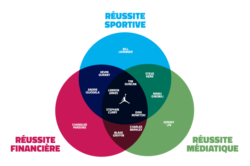 Je me suis ainsi amusé à faire un diagramme de Venn de ces trois plans, avec un placement subjectif de certains joueurs qui caractérisent ce que j’entends par là. L’idée est surtout de montrer qu’il n’est pas simple d’intégrer cette “Jordan Zone”, qui marque le succès d’un joueur NBA sur les trois plans de réussite, Michael Jordan étant l’exemple ultime du joueur ayant gagné beaucoup d’argent et de titres, tout en ayant une très bonne image publique.