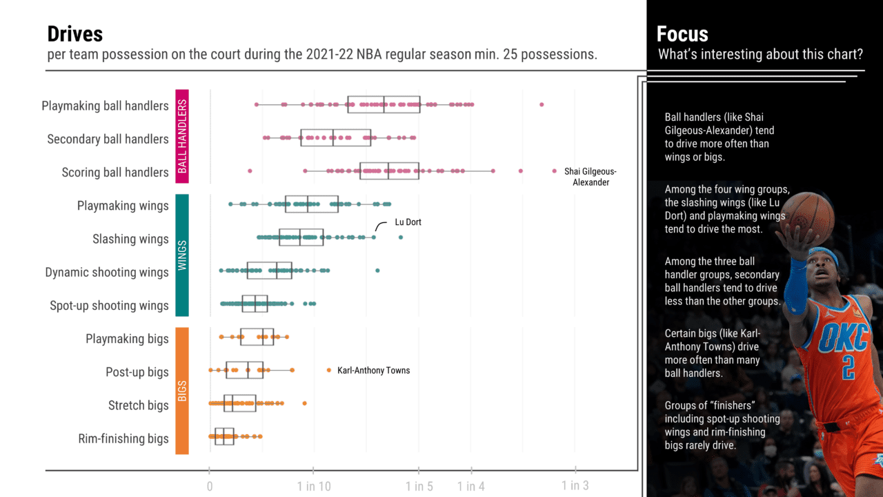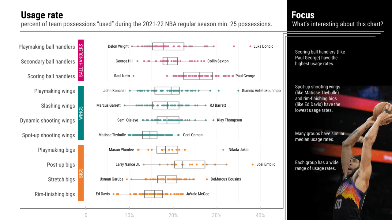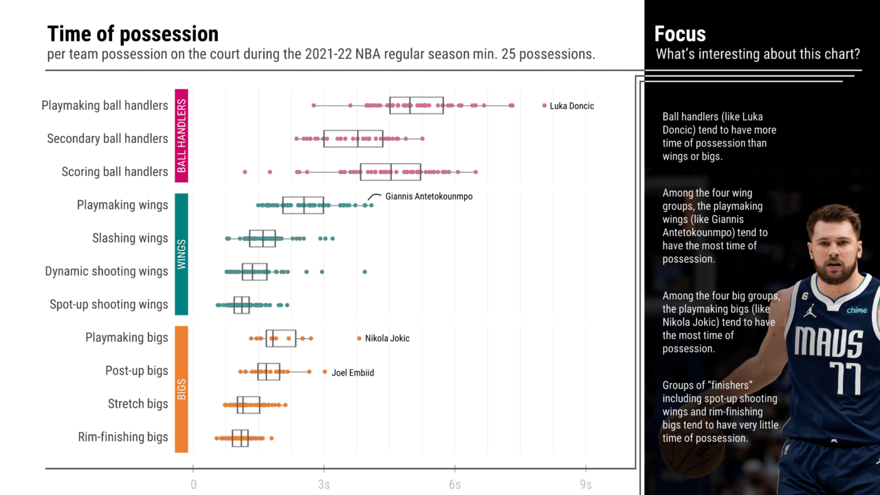 Ainsi, pour les données de la saison 2021/22 (25 possessions minimum), Luka Doncic est le “porteur de balle créateur” avec le plus fort taux d’usage, Collin Sexton est un exemple de “porteur de balle secondaire” et Paul George de “porteur de balle scoreur”.