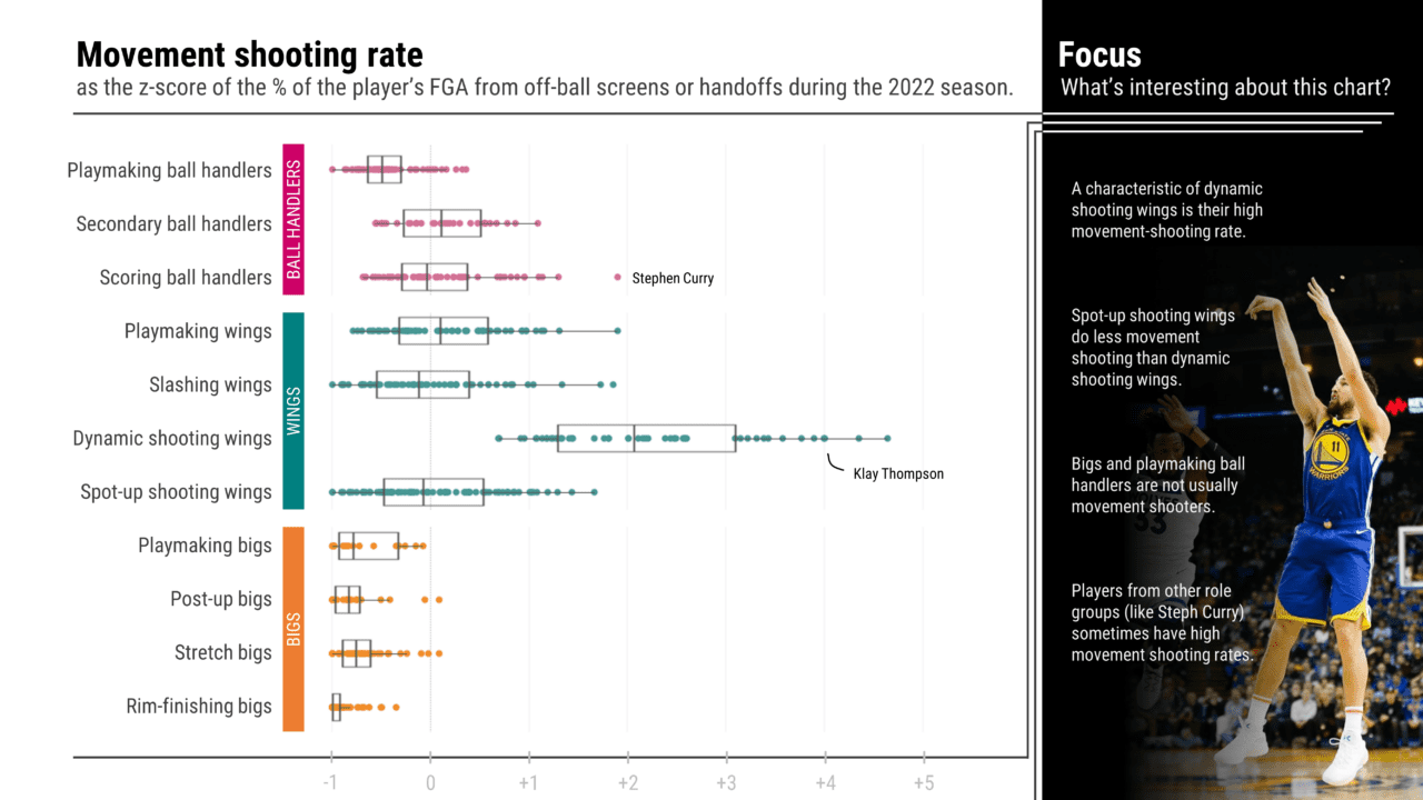 Le mouvement des shooteurs (utilisation des écrans sans ballon et du main-à-main) est également intéressant, même si Todd Whitehead explique que c’est un peu biaisé car ce mouvement est un des facteurs de définition des postes.