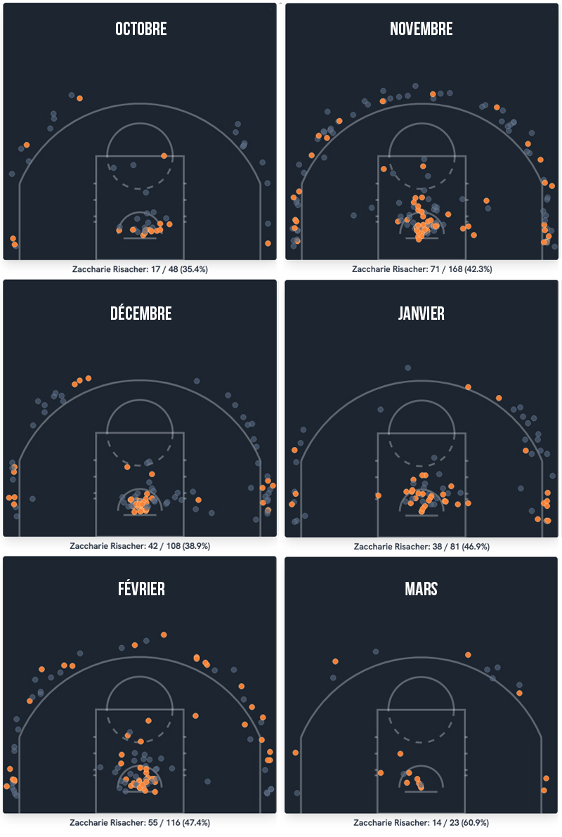 Titulaire depuis son 3e match NBA, Zaccharie Risacher a ainsi gagné en aisance ces dernières semaines. Un peu plus de quatre mois après ses premiers pas en NBA, il occupe déjà un rôle majeur au sein d’une équipe qui se bat pour les playoffs, à la différence des derniers n°1 de Draft, souvent sélectionnés par des franchises en totale reconstruction et sans pression d’un résultat collectif.