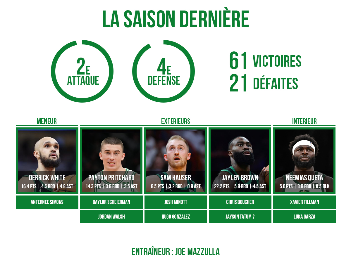 Dans une conférence Est aussi ouverte, l’expérience des joueurs présents ces dernières saisons sera un atout précieux pour se maintenir dans la première partie de tableau. Elle le sera tout autant pour intégrer les recrues dans l’effectif. De Luka Garza à Baylor Scheierman, de nombreux joueurs auront à cœur de prouver qu’ils peuvent s’inscrire dans la durée dans cette équipe une fois le retour de Jayson Tatum et des ambitions.