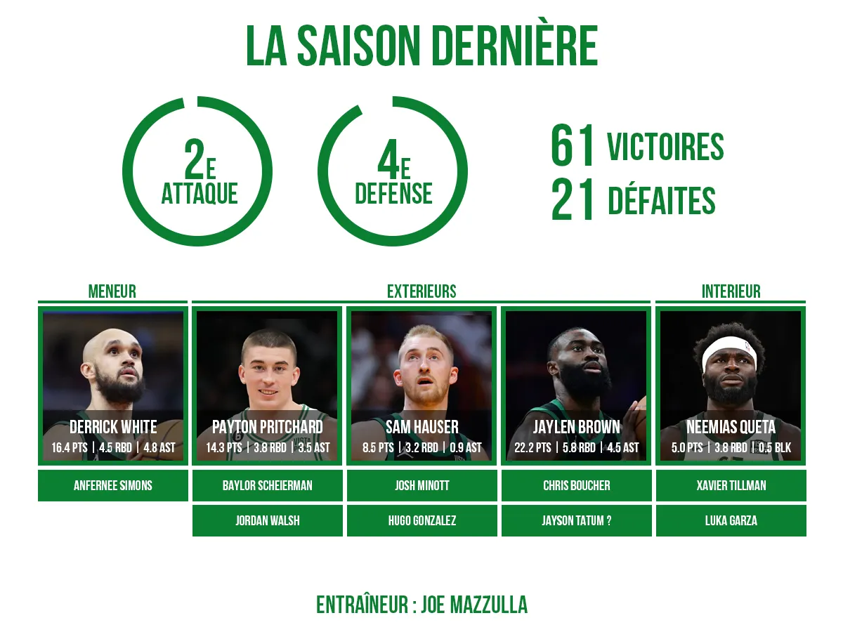 Brad Stevens n'a pas fait les choses à moitié pour repasser sous le « second apron » et ses différentes pénalités. Les vétérans à haut salaire comme Jrue Holiday et Kristaps Porzingis ont été échangés pour des contreparties très modestes. Al Horford n'a, lui, pas été prolongé. C'est donc une saison de transition que s'apprêtent à vivre les Celtics avec un effectif clairement amoindri.