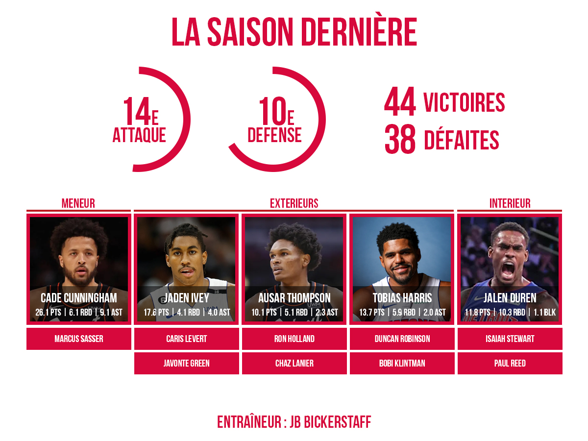 Pour les remplacer, les dirigeants ont tenté des coups, avec le trade pour Duncan Robinson, un des snipers les plus fiables de la ligue depuis de nombreuses saisons, et Caris LeVert, référencé pour ses qualités offensives en sortie de banc tant comme finisseur que comme créateur. Des signatures malignes, qui devraient permettre aux Pistons de ne pas trop perdre au change, tout en laissant suffisamment de place aux espoirs du roster. Outre Cunningham, qui a franchi un palier pour devenir une authentique star de la ligue à 24 ans, Jalen Duren, Jaden Ivey, Ausar Thompson, Ron Holland II et même Isaiah Stewart ont tous moins de 25 ans.