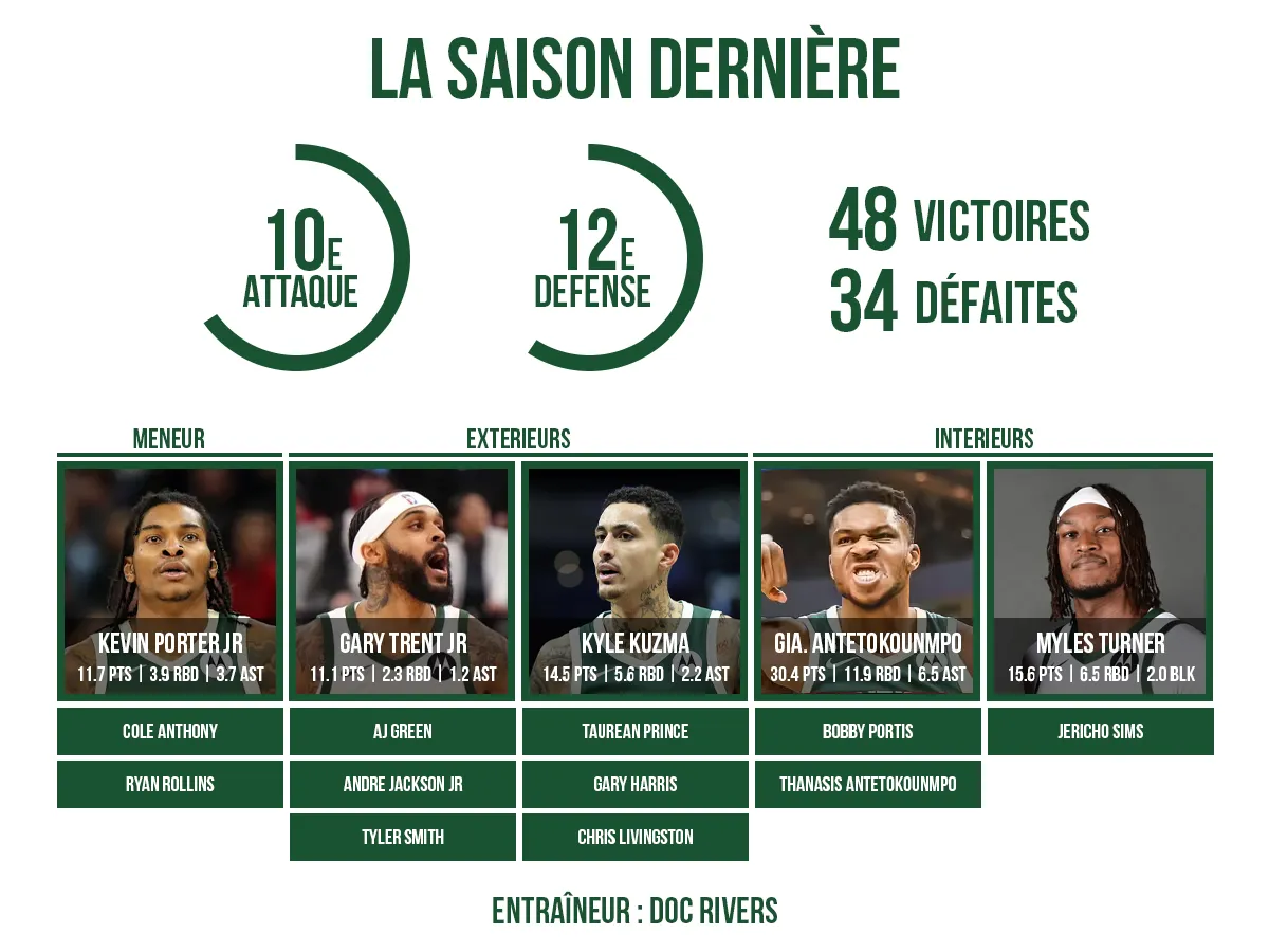 Le contrat du meneur All-Star a été lissé dans le temps pour conserver un peu de flexibilité financière. Myles Turner a été arraché aux Pacers pour succéder à Brook Lopez sous le cercle. Un ajout intéressant, qui vient combler le besoin en spacing et en couverture de cercle qu'offrait Brook Lopez, mais avec quelques années de moins. Myles Turner n'en reste pas moins un lieutenant plus qu'un bras droit, et Giannis Antetokounmpo va porter sur ses larges épaules les responsabilités offensives de l'équipe.
