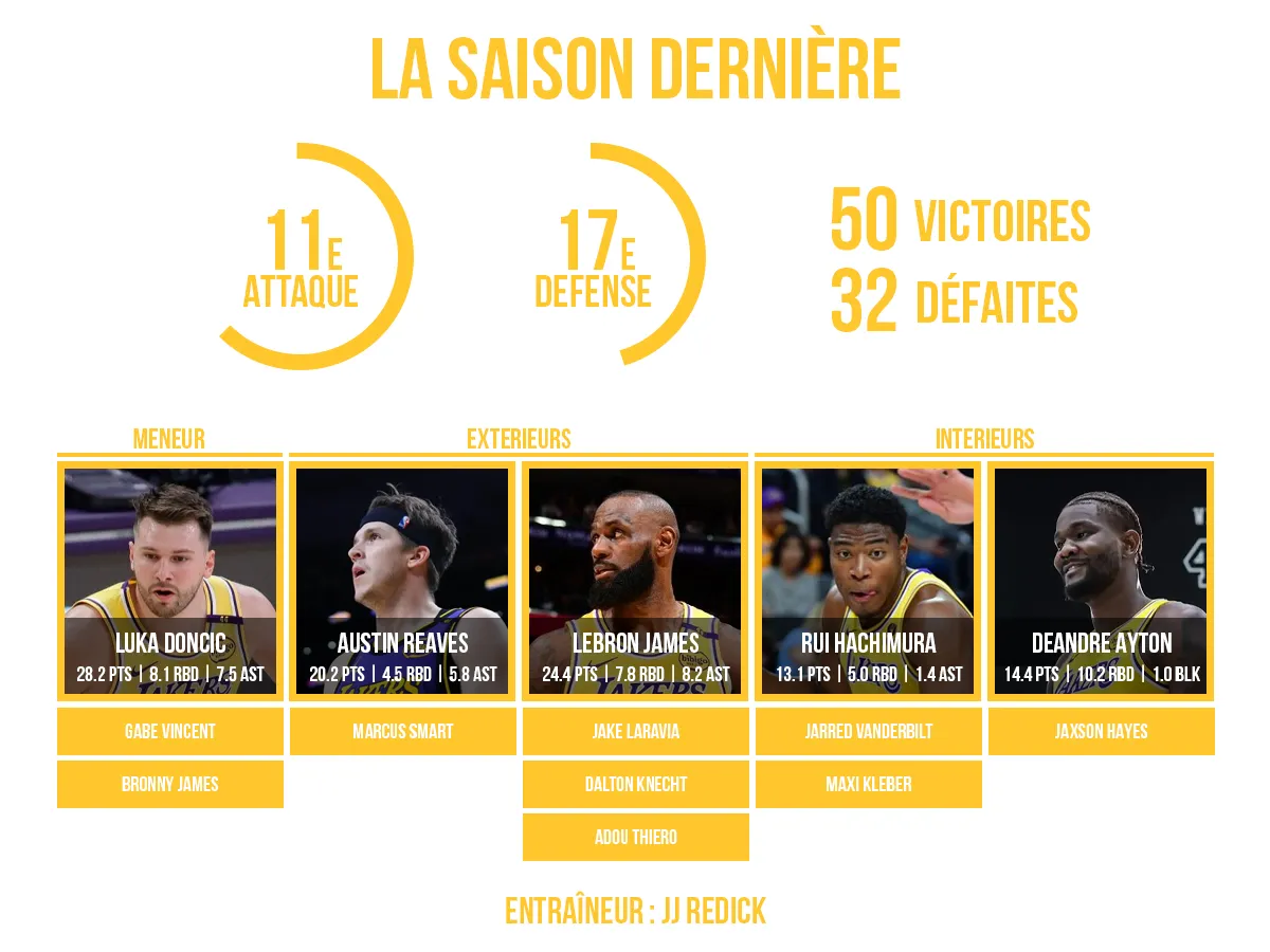 Rui Hachimura devrait pour le moment conserver sa place de titulaire, alors que le banc tournera de nouveau autour de Gabe Vincent, Dalton Knecht, Jarred Vanderbilt, Jaxson Hayes, aidés par Jake LaRavia, autre recrue estivale plutôt intéressante. Une même recette, pour de meilleurs résultats ?
