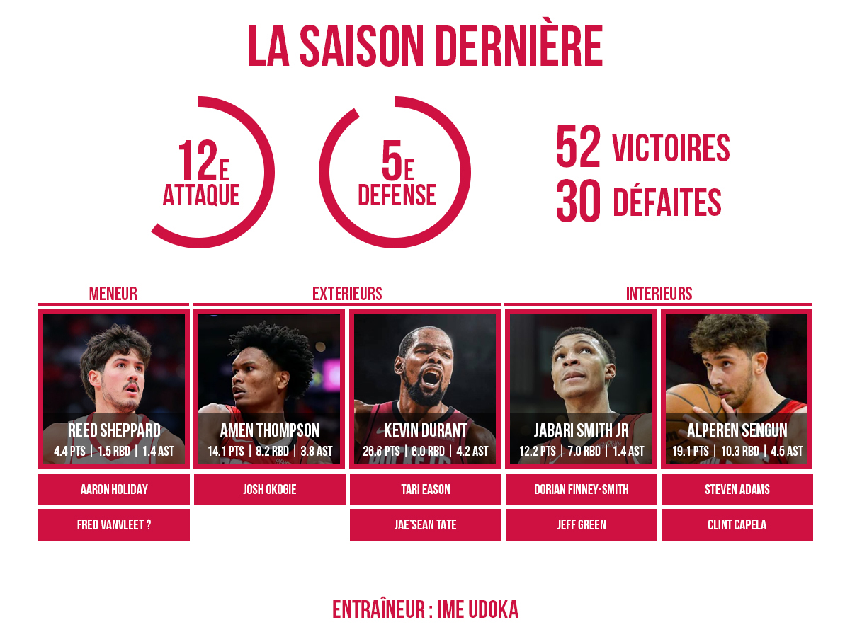 L’élimination dès le premier tour des playoffs par les Warriors, tête de série numéro 7, a mis en avant les limites offensives de ces Rockets. Aucun des six meilleurs scoreurs de la série contre Golden State n’a atteint les 50% au tir. Et le meilleur marqueur en saison régulière, Jalen Green, s’est complètement éteint, avec 38 points dans le Game 2 et 45 dans les six autres rencontres. C’est là qu’entre en scène Kevin Durant, un des attaquants les plus fiables et réguliers de l’histoire, toujours impressionnant avec ses 26.6 points de moyenne à 52.7% à 36 ans la saison dernière avec les Suns. Le double champion NBA sera amené à être l’un des leaders offensifs de cette escouade tout en lui apportant un boost supplémentaire d’expérience dans les grands moments.