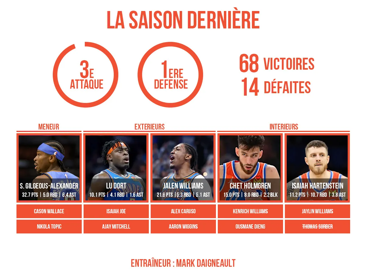 Mark Daigneault tirera sans doute quelques enseignements des derniers playoffs qui avaient vu les Nuggets et les Pacers aller jusqu’au Game 7. Oklahoma City peut notamment progresser dans son jeu sur demi-terrain face à des équipes qui parviendraient à limiter Shai Gilgeous-Alexander.