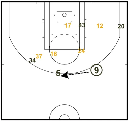 Allen (20) dans le corner et Perkins (43) poste bas, l'objectif est de laisser le champ libre à l'ailier des Celtic sur la partie gauche du terrain. Bryant (24) défend sur Rondo (9), et lui laisse volontairement du champ pour le pousser à shooter, afin de prendre avantage de sa faible réussite extérieur. Rondo a remonté la balle et la passe à Garnett (5) en tête de raquette.