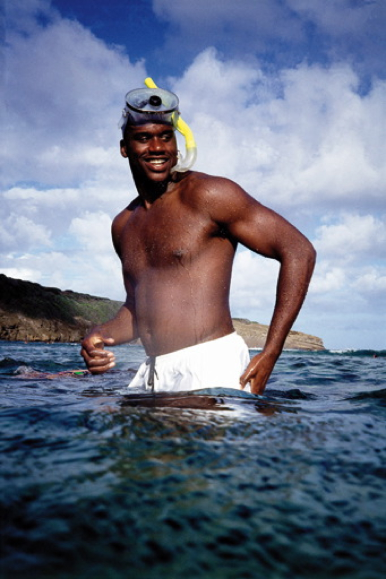 Shaq n’était absolument pas à l’aise dans l’eau mais il voulait pêcher. On lui a donné un tuba, un masque… La plongée, la pêche et même la natation, ce n’était pas du tout son truc. On peut dire qu’il nageait très mal. On lui avait donné des appâts. Il les jetait autour de lui pour attirer les poissons qui, évidemment, n’allaient pas dans la mare où il était. On en a beaucoup ri… Cette photo est le reflet de la personnalité du Shaq, il s’était prêté au jeu très facilement. Il a toujours été facile de faire des photos mises en scène ou spontanées avec Shaquille O’Neal. »