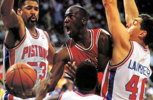 Le 23 avril 1988, il marque 59 points et permet à Chicago de disposer des Pistons, l’équipe la plus rugueuse de la Ligue. Cette prestation à Detroit est vécue par Chuck Daly, le coach des « Bad boys », comme une véritable humiliation. C’est à cette époque qu’il élabore les fameuses « Jordan rules », stratégie défensive visant à limiter le rayonnement du boulimique attaquant chicagoan. La règle n°1 consiste à ne jamais laisser Michael démarrer son premier dribble. Règle n°2 : préparer un joli comité d’accueil au cas où il lâcherait son défenseur. Le cas échéant, Jordan trouve sur le chemin du panier trois têtes brûlées, Dennis Rodman, Bill Laimbeer et Rick Mahorn, prêtes à tout pour faire rempart. Tous les coups sont permis. Y compris, évidemment, les mauvais.