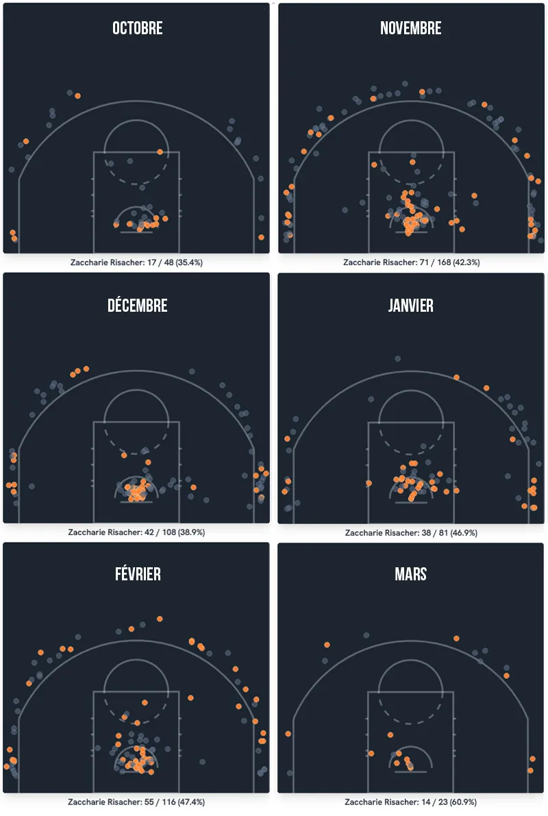 Titulaire depuis son 3e match NBA, Zaccharie Risacher a ainsi gagné en aisance ces dernières semaines. Un peu plus de quatre mois après ses premiers pas en NBA, il occupe déjà un rôle majeur au sein d’une équipe qui se bat pour les playoffs, à la différence des derniers n°1 de Draft, souvent sélectionnés par des franchises en totale reconstruction et sans pression d’un résultat collectif.