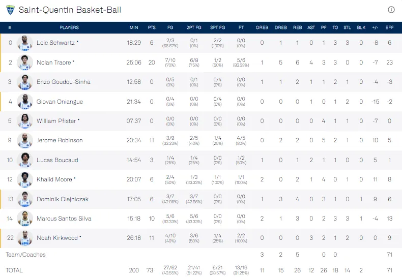 Il y avait d'ailleurs la place pour passer, alors que Nolan Traoré a fait parler sa vitesse pour faire souffrir les défenseurs adverses tout le match. Le jeune prodige tricolore termine avec meilleur marqueur de son équipe avec 20 points à 7/10 au tir dont 1/2 de loin, 6 rebonds et 4 passes mais également 3 pertes de balle.