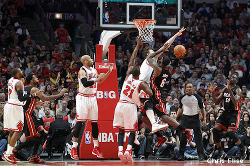 Le début de match démarre fort, avec beaucoup d’intensité. Le jeu de Miami permet à Chris Bosh de prendre des shoots. Mais il n’a pas de réussite. En face, les Bulls, bien que le MVP 2011 soit absent, mettent leur jeu en place et Carlos Boozer est présent dans tous les secteurs. Preuve que l’intensité est là, Luol Deng prend une technique pour avoir râler et Scottie Pippen, présent au bord du terrain, est déchaîné.