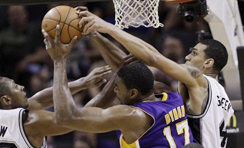 C’est un authentique exploit qu’ont réalisé cette nuit les Lakers. Sans Kobe Bryant, toujours blessé au tibia, les hommes de Mike Brown s’imposent 98-84 à San Antonio avec un Andrew Bynum en mode record : 16 pts et surtout 30 rebonds (record personnel, et record de la saison en NBA) ! A lui tout seul, le pivot des Lakers prend quasi autant de rebonds que tous les Spurs réunis (33 prises).