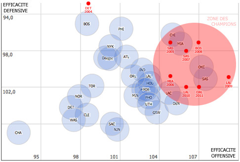 Car la NBA sacre quasiment systématiquement les équipes qui proposent le meilleur rapport entre efficacité offensive et efficacité défensive, ce que l’on peut appeler la “zone des champions”.