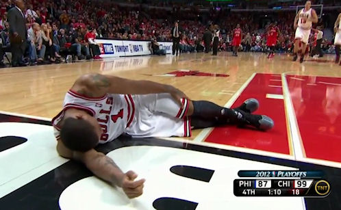 Il était à 23 points, 9 rebonds et 9 passes à 1 minute et des poussières de la fin d’un match maîtrisé de bout en bout par ses Bulls ; et pourtant, Derrick Rose est encore sur le parquet. Il s’engage dans une pénétration, prend ses appuis, son genou vrille, le MVP en titre est à terre…