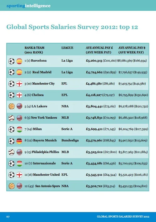 D'ailleurs, si l'on s'appuie cette fois-ci sur le salaire moyen dans les clubs professionnels, les Lakers se hissent à la 5ème place avec un salaire moyen de 4.7 millions d'euros par joueur. Devant les coéquipiers de Kobe Bryant, quatre clubs de foot : FC Barcelone (6.5 millions), le Real (5.9), Manchester City (5.7) et Chelsea (5.2).