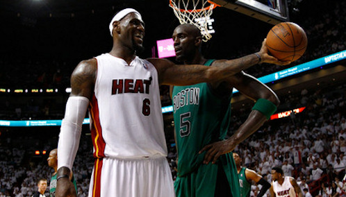 Le match est plié mais Kevin Garnett ne lâche rien. Une belle faute pour empêcher un panier facile de LeBron James, à qui il glisse quelques mots à l’oreille.