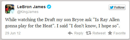 “Alors qu’on regarde la draft, mon fils Bryce me demande si Ray Allen va venir jouer au Heat. Je lui réponds que je n’en sais rien mais que je l’espère“, a écrit James sur son compte Twitter.