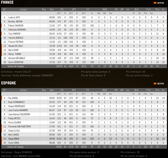 Les débats sont équilibrés en ce premier quart (15-15), la rapidité du jeu français est confrontée à la force intérieure du duo Gasol – Ibaka. Les deux NBAers alternent avec le Thunder qui démontre que son 11/11 face à TP (déjà) en playoffs n’était pas un coup de chance alors que le Laker vient se frotter à la raquette française qu’il domine en taille. Avec respectivement 8 et 15 points à la pause, ils permettent à l’Espagne de rester au contact à la pause (39-37).