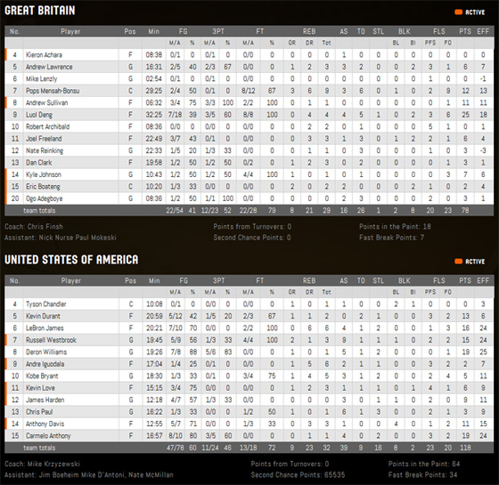 Sans trop forcer, les Américains ont écrasé la Grande-Bretagne de 40 points : 118-78. La seconde mi-temps a été une longue souffrance pour les sujets de Sa Majesté et un régal pour les 16 979 spectateurs de Manchester venus voir leurs idoles de la NBA.
