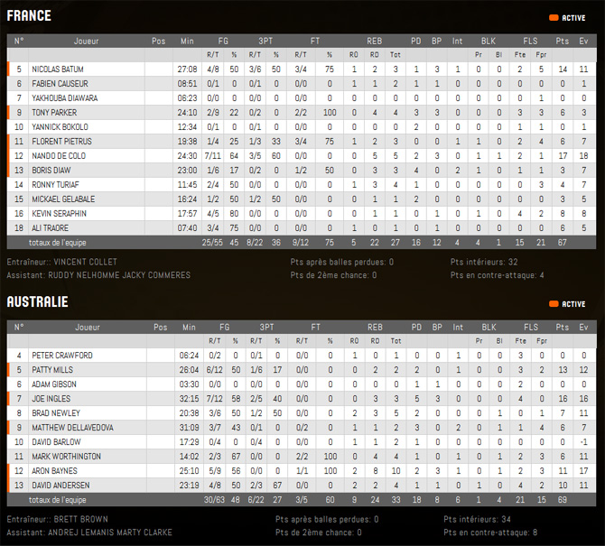 Les Bleus sont à la traîne à la pause (40-30) et c’est aussi le plus gros écart du match. Joe Inglès et ses 12 points n’y sont pas innocents mais, et sans chauvinisme, cela n’a rien de véritablement alarmant quand on constate le 0/4 de Parker ou le 2/6 de Batum. Les systèmes sont les bons, les intentions sont là, il faut désormais conclure les actions, à l’instar d’un Nando De Colo toujours aussi magistral (7 points, 4 rebonds).