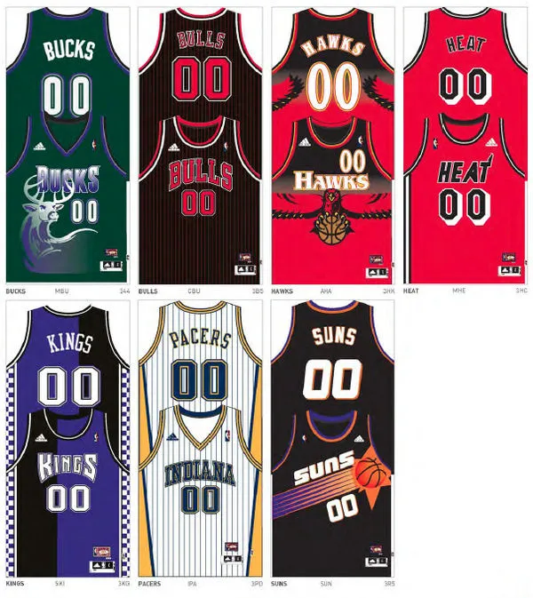 Seront concernés Indiana (maillot domicile de 1997-98 à 2004-05), Milwaukee (fin des années 90), Chicago (milieu des années 90), Atlanta (maillot extérieur fin des années 90), Miami (fin des années 90), Sacramento (milieu des années 90), Phoenix (années 90), Philadelphie (maillot extérieur début des années 90), Cleveland (maillot extérieur milieu des années 90), Toronto (maillot domicile fin des années 90), Houston (maillot extérieur fin des années 90), et Utah (maillot extérieur fin des années 90).