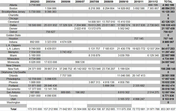 Sept équipes n'ont par contre jamais payé la luxury tax : Charlotte, Chicago, Golden State, les Clippers, New Orleans, Oklahoma City/Seattle et Washington.