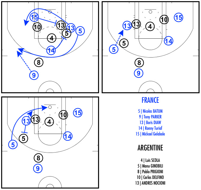 Boris Diaw a profité d’un écran de Mickael Gelabale pour prendre la position poste bas. Il reçoit le ballon et la redonne vite à Nicolas Batum qui coupe vers le cercle. Avec ses longs bras, il est très difficile de l’arrêter.