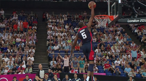 Ce dernier nous place un dunk dont il a le secret, et le premier KO technique est clairement dans l’air londonien (64-51). Kevin Durant choisit alors son moment pour sortir les flingues de compétition. Le pistolero d’OKC dégaine à quatre reprises (19 points sur le match) dans la période et l’écart devient vertigineux (74-57).