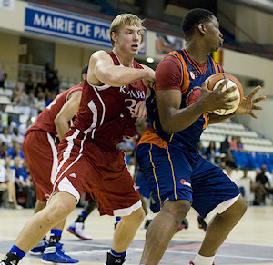 Le match débute sur un rythme élevé. Au regard du niveau d’intensité que mettent les deux formations, on doute du caractère amical de la rencontre. Antoine Diot, auteur de 10 pts, 9 pds et 3 ints, semble déjà à la maison à Coubertin et il sonne les premières charges pour donner à l’AWM Team une légère avance d’entrée de jeu. Kévin Séraphin (16 pts, 6 rbds) a débuté la rencontre sur le banc mais en fin de premier quart-temps, il décide d’imprimer sa marque en réalisant quelques blocks très musclés. Le score est de 20-10 pour la sélection pro mais le « jeunes » Jayhawks vendront chèrement leur peau à l’image du Freshman Andrew White auteur de 15 points et nullement impressionné de se frotter à ces vieux briscards.