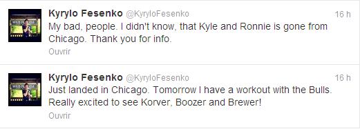 Ancien joueur du Jazz et sans contrat actuellement, l’intérieur s’est rendu à Chicago pour y effectuer un workout avec les Bulls. A son arrivée, le pivot ukrainien s’est empressé de faire savoir à ses “followers” à quel point il était impatient de retrouver les anciens Jazz que sont Carlos Boozer, Ronnie Brewer et Kyle Korver…Problème, Korver a été envoyé à Atlanta tandis que Brewer s’est engagé avec les Knicks cet été.