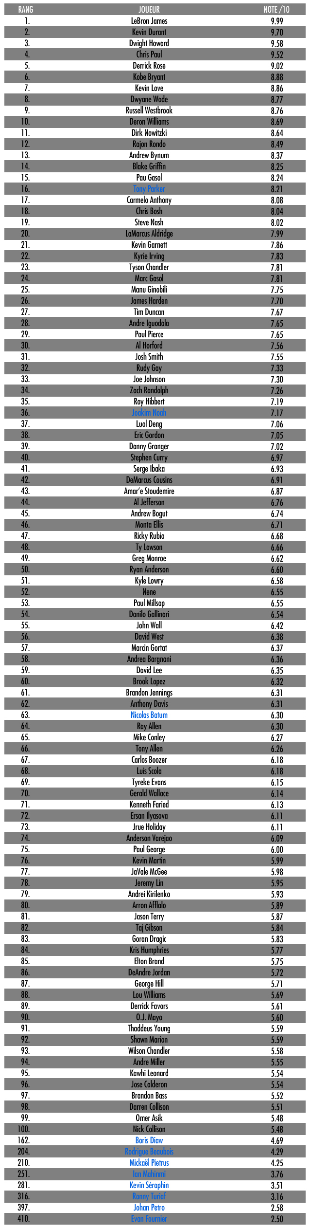 Les supporters des New York Knicks ont eux aussi beaucoup protesté, Carmelo Anthony étant 17e alors qu’Amar’e Stoudemire se classe 43e. Côté français, Tony Parker est 16e, Joakim Noah 36e et Nicolas Batum 63e. Les autres Bleus sont au-delà de la 100e place.