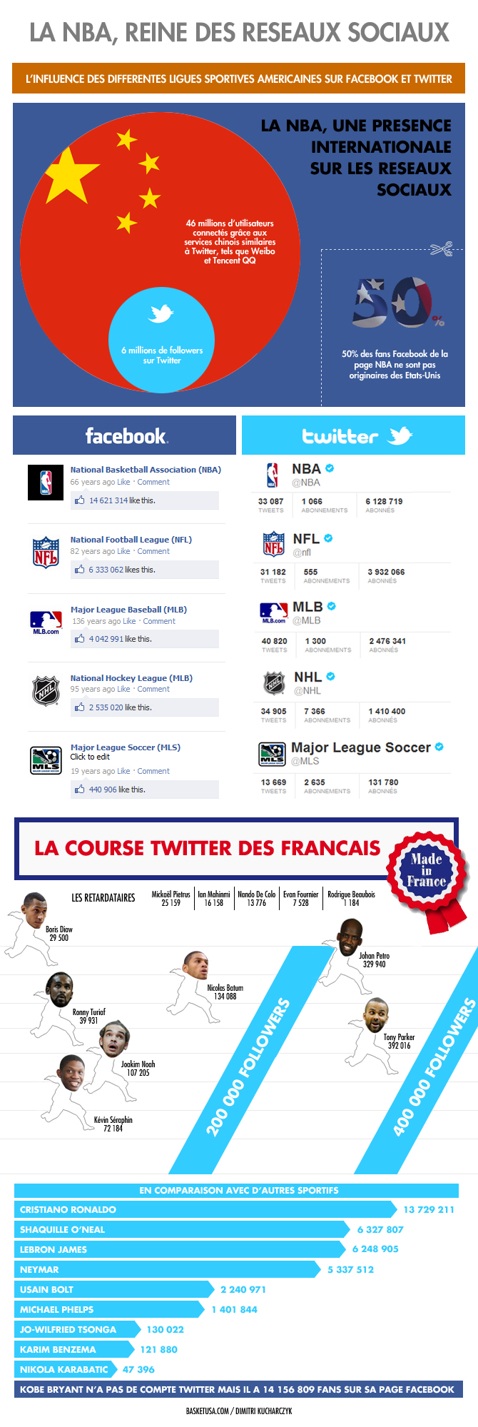 La NBA a très vite compris l’utilité des réseaux sociaux pour développer son influence internationale. Réactive et active, elle est aujourd’hui la première ligue de sport américaine sur Facebook et Twitter alors qu’elle reste pourtant assez loin du football américain en termes d’audience et de recettes.